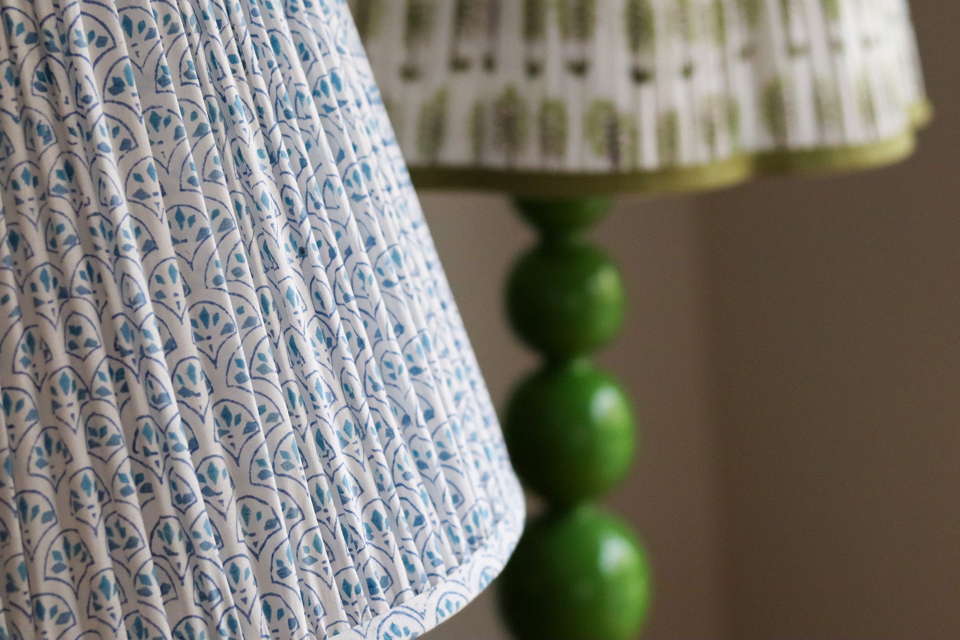 With its intricate fan shapes this elegant blue lampshade creates a subtle yet graceful addition to any room. Pair it with our Royal Blue Base for that added impact or keep things light and pastel with our Pale Blue Bamboo base for sophisticated calm