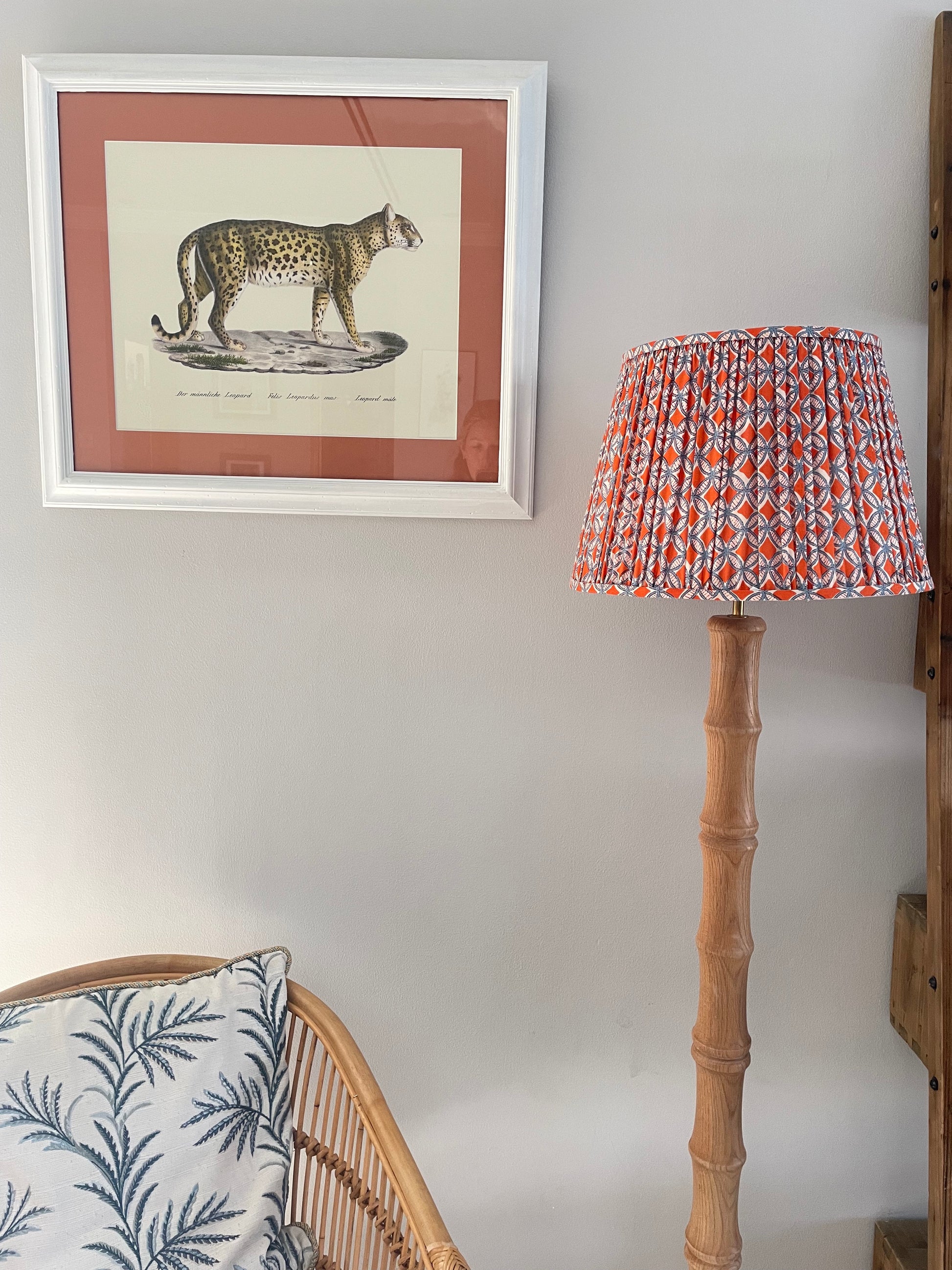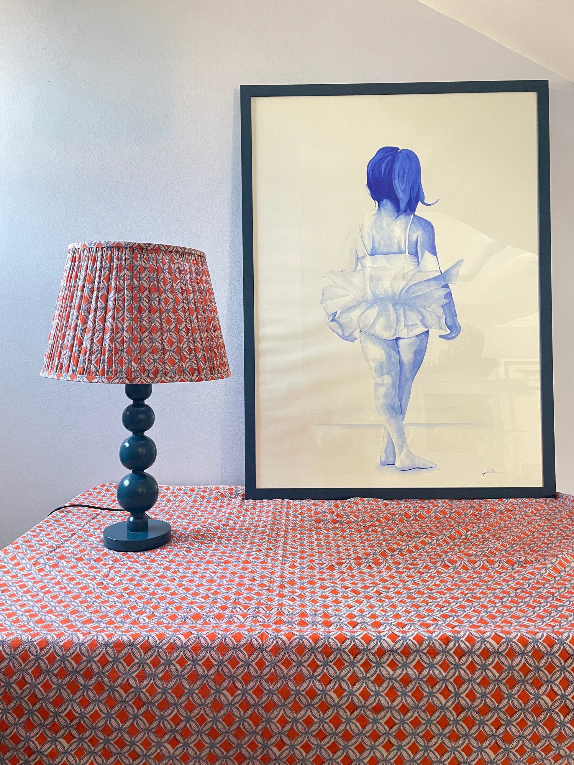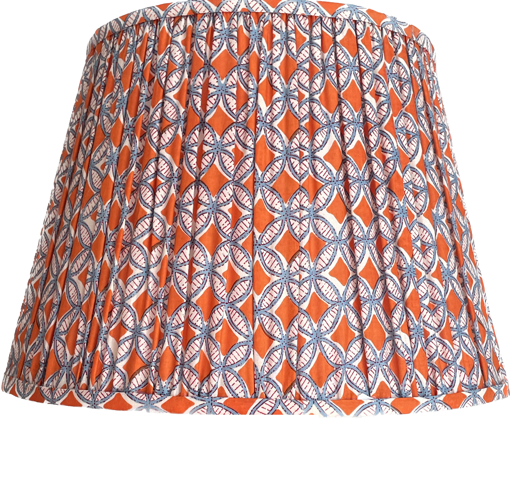 This striking orange and blue diamond print lampshade makes a statement and is hard to resist when paired with our blue bobbin base.